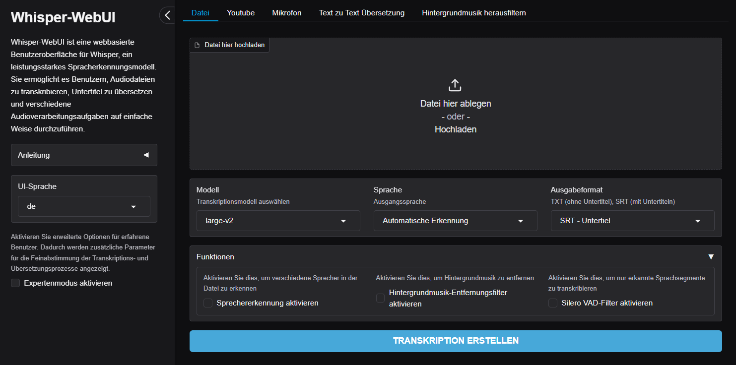 Whisper-WebUI bietet eine Standard-Oberfläche, die vorkonfigurierte Einstellungen für die wichtigsten Funktionen liefert. Dies ermöglicht eine schnelle und unkomplizierte Nutzung, bei der Features einfach ein- oder ausgeschaltet werden können, wie beispielsweise: